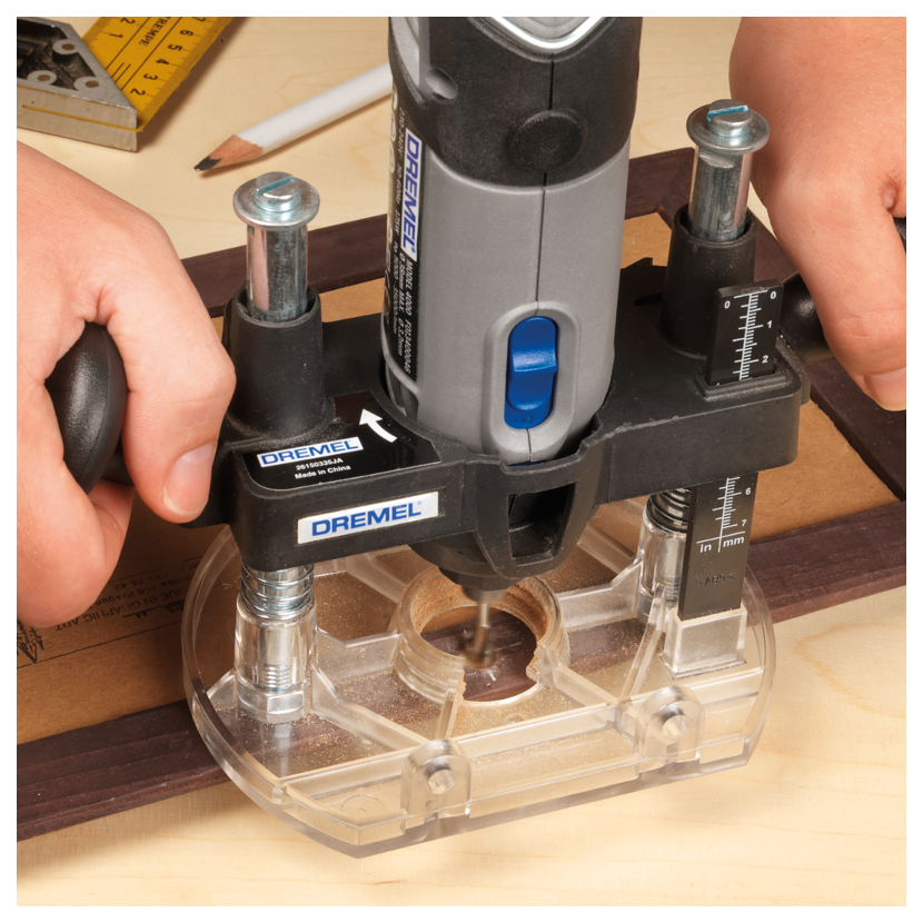 • Nástavec změní nářadí Dremel v zapichovací frézku pro frézování kruhů, znaků a intarzií, ozdobných hran a frézování paralelně k hranám.