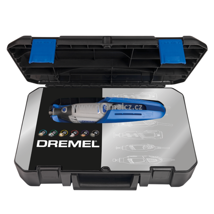 Tato sada Dremel zahrnuje výkonné univerzální nářadí model Dremel 4000 s novým upínacím pouzdrem EZ Twist. To znamená, že k výměně není nutný klíč ani šroubovák. To vše je přehledně uspořádáno v kufříku, který obsahuje také vyjímatelný organizér na příslušenství a držák nářadí a kabelu na zeď. Tento praktický přenosný kufřík dále obsahuje ohebnou hřídel, přímořezný a vykružovací nástavec, opěrný nástavec pro jemnou práci a vodicí nástavec. Součástí je dalších 65 kusů originálního příslušenství Dremel.