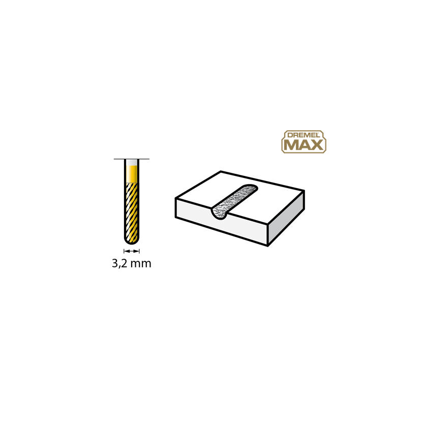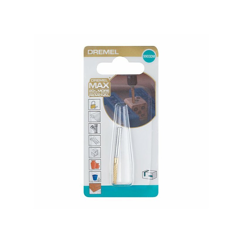 Řada příslušenství Dremel® Max navržená našimi designéry zajišťuje maximální odolnost a dlouhotrvající výkonnost. Řezací bit Dremel Max 9903DM z tvrdokovu pro náročné použití je potažen nitridem titanu a vydrží 2krát déle než standardní nepotažené příslušenství a odebírá o 20 procent více materiálu než klasický 9903.
