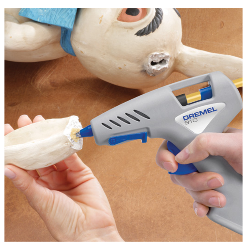 Dremel 910 je vysokoteplotní (165 °C) lepicí pistole s hrotem pro přesné lepení a ochranou proti kapání. Díky malé velikosti a dobré ergonomice (držadlo ve tvaru T, stabilní základna, rozkládací stojánek) se jedná o ideální nářadí pro rychlé, nenáročné kutilské práce kolem domu, jako je lepení keramiky, dřeva, plastů, skla atd. Vhodná pro 7 mm lepicí tyčinky.