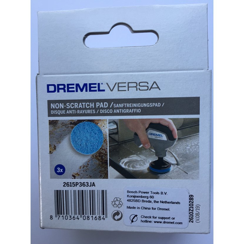 Dokonale se hodí na povrchy, které vyžadují drhnutí bez poškrábání. Neabrazivní podložka Dremel Versa se hodí pro použití v interiéru i exteriéru a je ideální na hrnce, pánve, dřezy a další. I přes svou velkou plochu se snadno vejde i do těsných prostorů. Zkombinujte vysoké otáčky přístroje Dremel Versa s univerzální čisticí podložkou a práce bude hotová během chvilky.